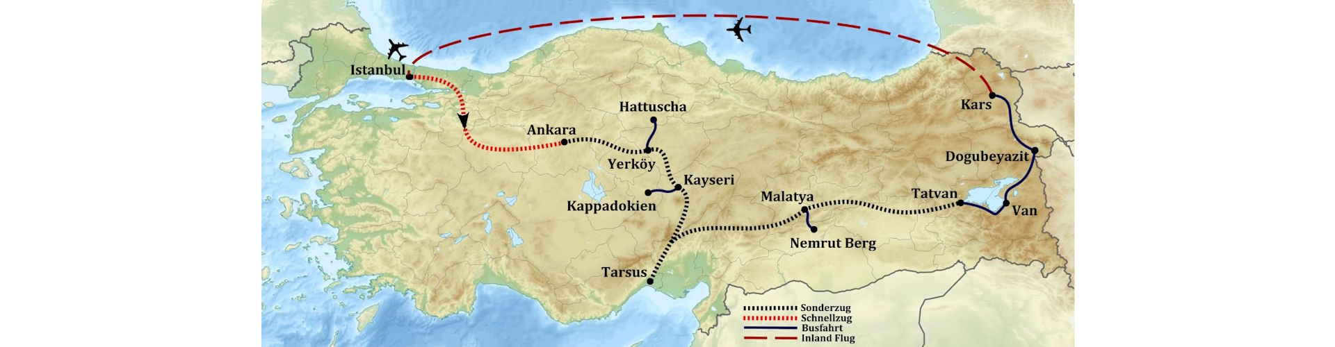 Auf dieser Reise werden Sie innerhalb von wenigen Tagen die wichtigsten Sehenswürdigkeiten der Türkei bewundern, die teilweise mit UNESCO Welterbe beschert sind. Die weiten Strecken in einem so großen Land wie die Türkei, die grösser ist als die doppelte Fläche von Deutschland, werden Sie in der bequemen Atmosphäre unseres Sonderzuges zurücklegen.